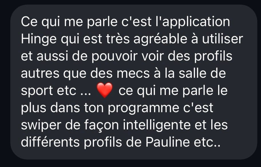 Je n’ai aucun contrôle sur les algorithmes. Mais si j’ai pu avoir, avec mes clientes, une expérience fun, légère et plaisante sur les apps, c’est grâce à la méthode contenue dans ce programme.