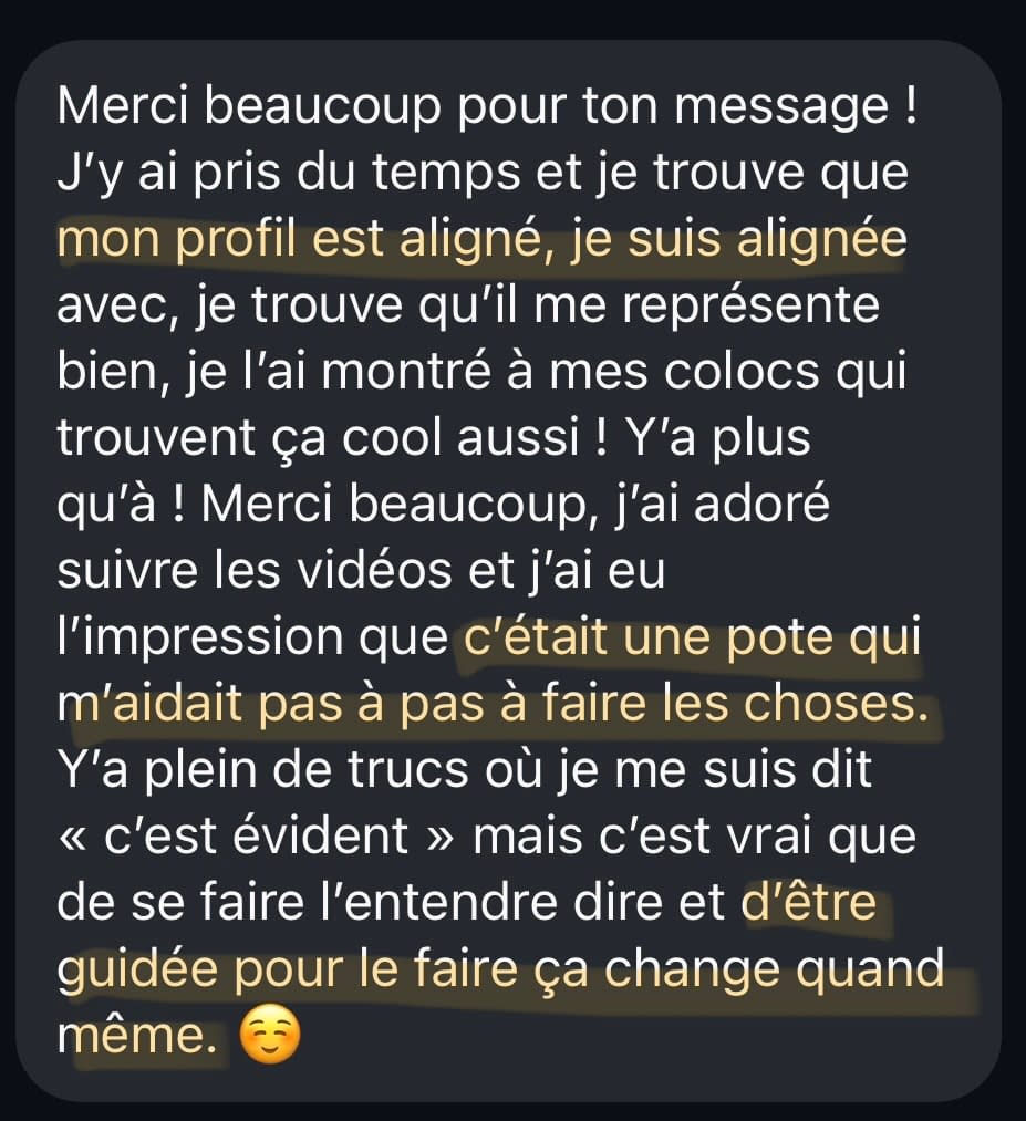 Si après avoir appliqué tous les principes du programme à la lettre, après plusieurs semaines tu n’as toujours eu aucun match positif, avec qui tu ressens une connexion et une potentielle compatibilité, je ferai un audit de ton compte pour voir où ça bloque et ce que tu peux ajuster. 🙂