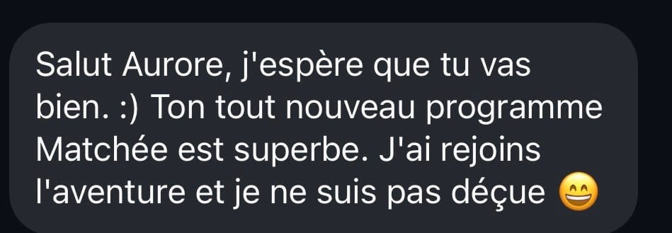 Le but est même je dirais d’avoir moins de matchs, mais plus alignés avec ta recherche et tes aspirations. Matchée te fait privilégier la qualité à la quantité. Et paradoxalement, tu vas moins être sur les apps… je t’en dis plus à l’intérieur du programme. 🙂